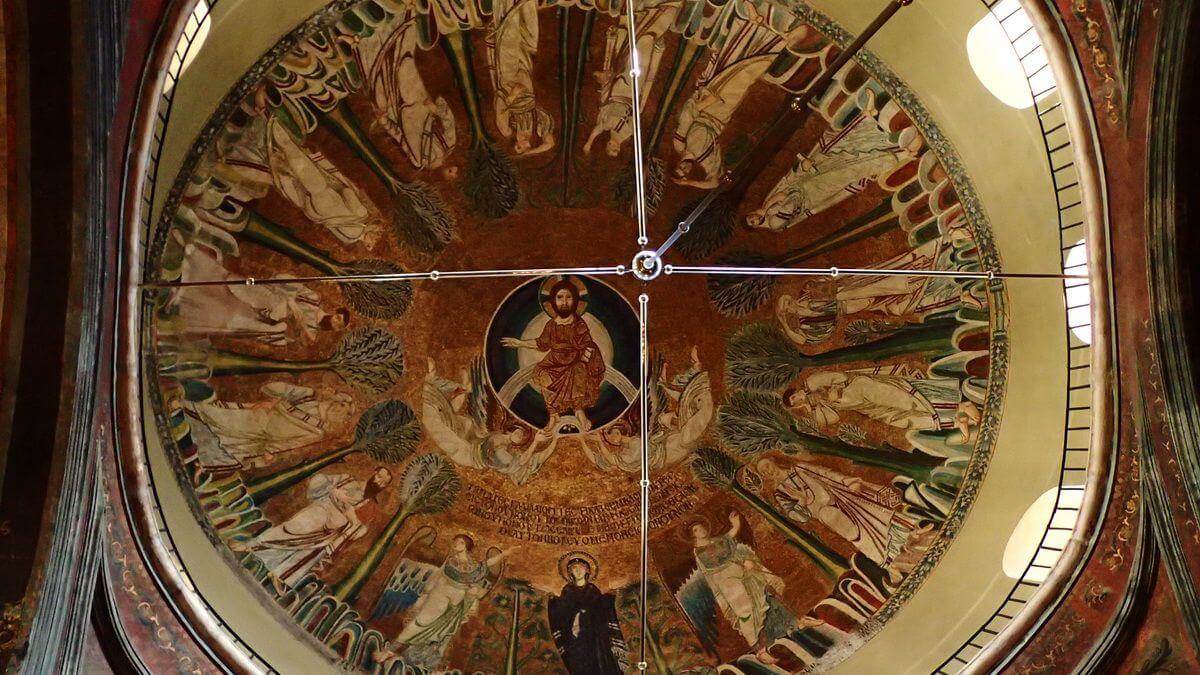 Το μωσαϊκό στον κεντρικό τρούλο – η Ανάληψη του Χριστού με την Παναγία και τους 12 Αποστόλους